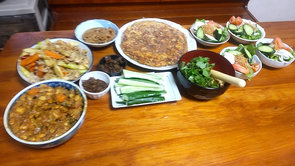 細竹と人参と白滝の炒め煮、新じゃがいもと新玉ねぎのキッシュ、もろキュウ、サラダ、納豆、昨日のカレー。